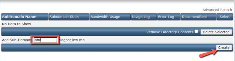 2. กรอกชื่อ Subdomain ที่ต้องการ แล้วกดปุ่ม Create