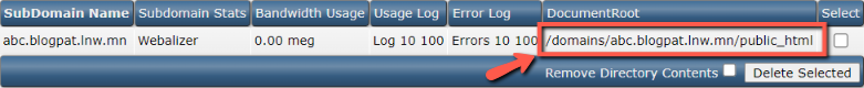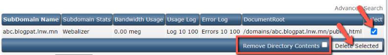2. เลือก Subdomain ที่ต้องการลบ แล้วกดปุ่ม Delete Selected