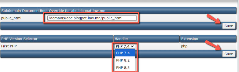 4.สามารถเปลี่ยน document root และตั้งค่า php version ได้ตามต้องการ เสร็จแล้วกด Save