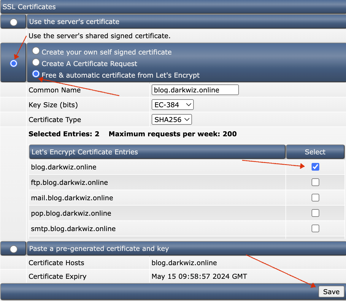 3. เลือก Free & automatic certificate from Let’s Encrypt ในช่องด้านล่างให้เลือกชื่อ Domain ที่ต้องการใช้งาน และกด Save ด้านล่าง