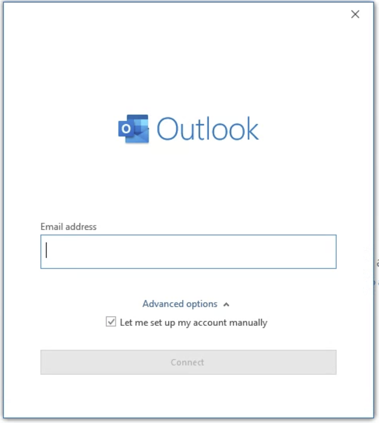 หรือในกรณีที่เคยเพิ่มอีเมลแล้วจะต้องเข้าผ่านเมนู File > Add Account - เมื่อมีหน้าต่างปรากฏขึ้นดังภาพด้านล่างให้ทำการเพิ่มอีเมลที่ต้องการใช้งาน และเลือก “Let me set up my account manaully” ที่ Advaced options และกด Connect