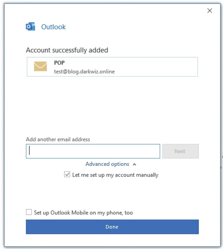 - เมื่อใส่ข้อมูลถูกต้องเรียบร้อย โปรแกรมจะแจ้งว่าการเพิ่มอีเมลสำเร็จ และถามต่อว่าต้องการเพิ่มอีเมลอีกหรือไม่หากไม่ต้องการเพิ่ม สามารถกด Done เพื่อเริ่มใช้งานอีเมลครับ